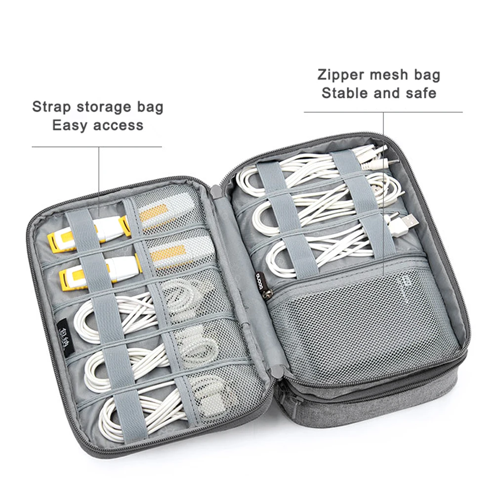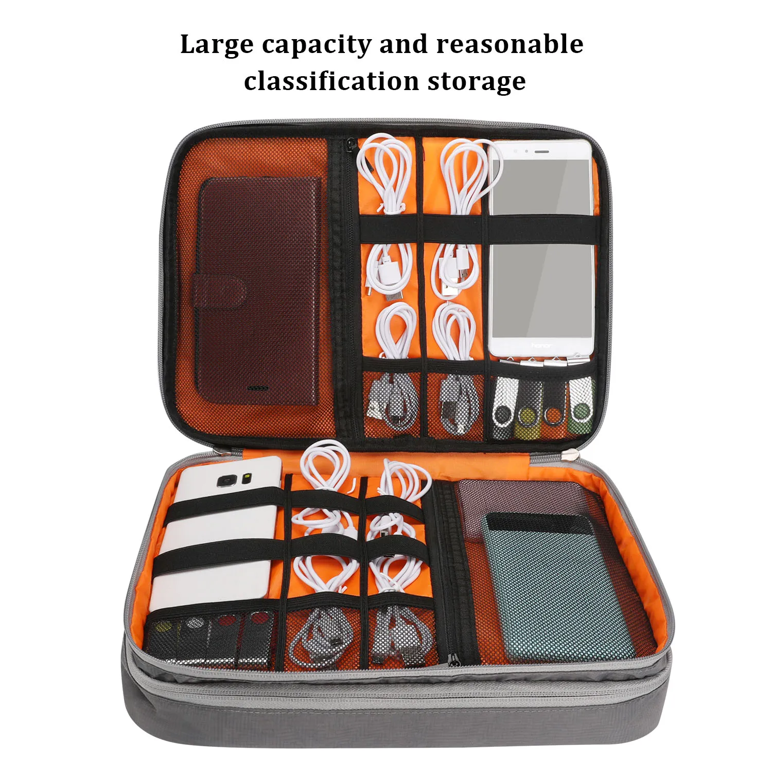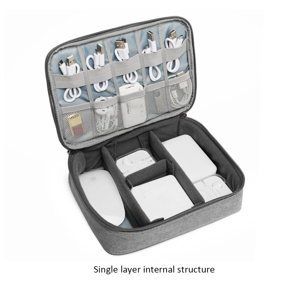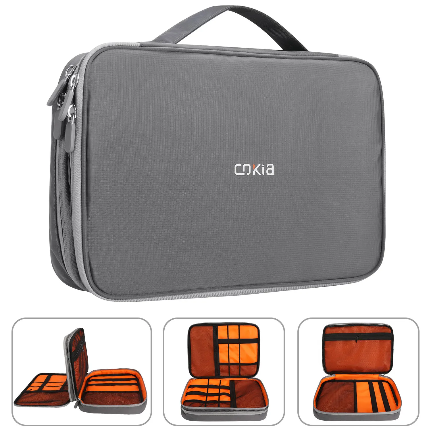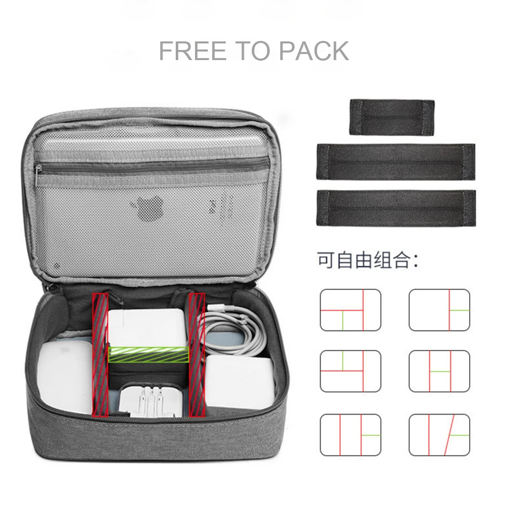 【Durable and High-Quality】: Made of lightweight and waterproof material. Fine workmanship, generous appearance 【Multi-Space】: Large capacity ,Organizer Pockets. Main pocket+ Functional bags.To hold various items like cables, flash disks, hard disk drives, power chargers, earphones, etc 【Multi-Function】: 8 elastic loops, different size mesh pouches, The design of the organiser allows you easy to get them in and out of, and it makes your home tidy and well organized 【Widely Applicability】: Great organizer for office use/ business trip/ holiday travel, perfect companion for your laptop bag or travel case 【Stylish and Compact】: Unique original design , stylish and compact,lines simple and direct fluency